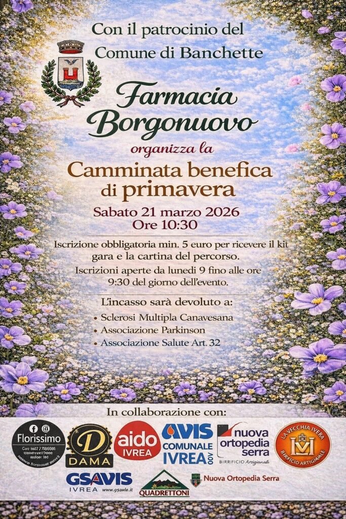 Sabato 21 marzo 2026 il territorio del Canavese ospiterà una speciale iniziativa all’insegna della solidarietà: la Camminata benefica di primavera, organizzata dalla Farmacia Borgonuovo con il patrocinio del Comune di Banchette.