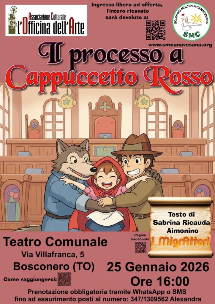 L’Associazione Culturale L’Officina dell’Arte porta in scena “Il processo a Cappuccetto Rosso”, una rivisitazione originale e divertente della celebre fiaba, capace di coinvolgere grandi e piccoli in un racconto sorprendente, ironico e ricco di emozioni.